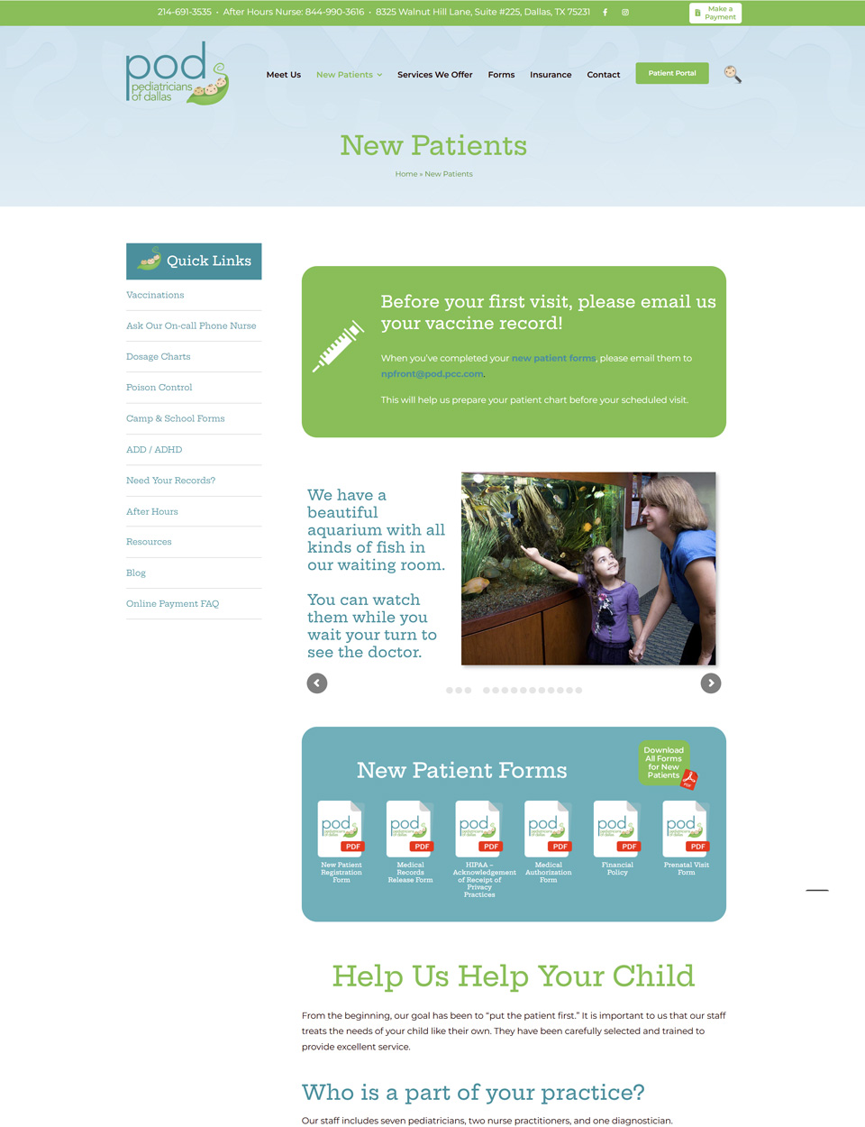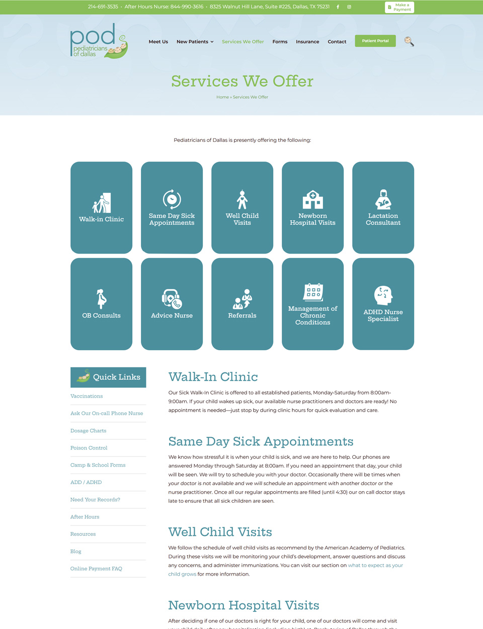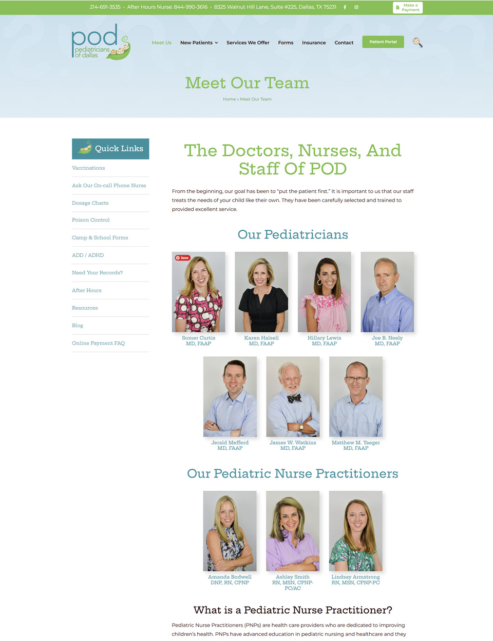 We worked closely with managers at Pediatricians of Dallas to collaborate on content and ensure that we covered all the bases, and we even coordinated an on-site photo shoot to take photographs of all the doctors and staff and the facility itself. We would later use these photos for a slideshow that parents could use to show their children what to expect before their first visit and for bios of each pediatrician, nurse practitioner, and diagnostic specialist.