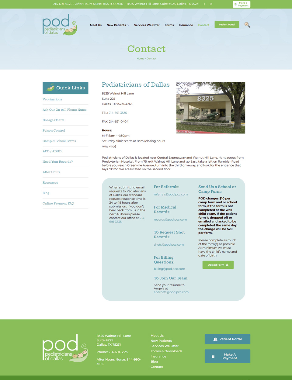 A slideshow on the homepage is frequently updated with news from the practice, from flu shots to water safety advice, and a blog allows the doctors to each express their own opinion on a variety of child-health subjects. We also re-branded all the practice’s forms with consistent typography and their new logo. We registered domain names for every physician in the practice and pointed them to the new site, and we negotiated the purchase of the pediatriciansofdallas.com domain name from a (non-physician) entity that had purchased it years ago.